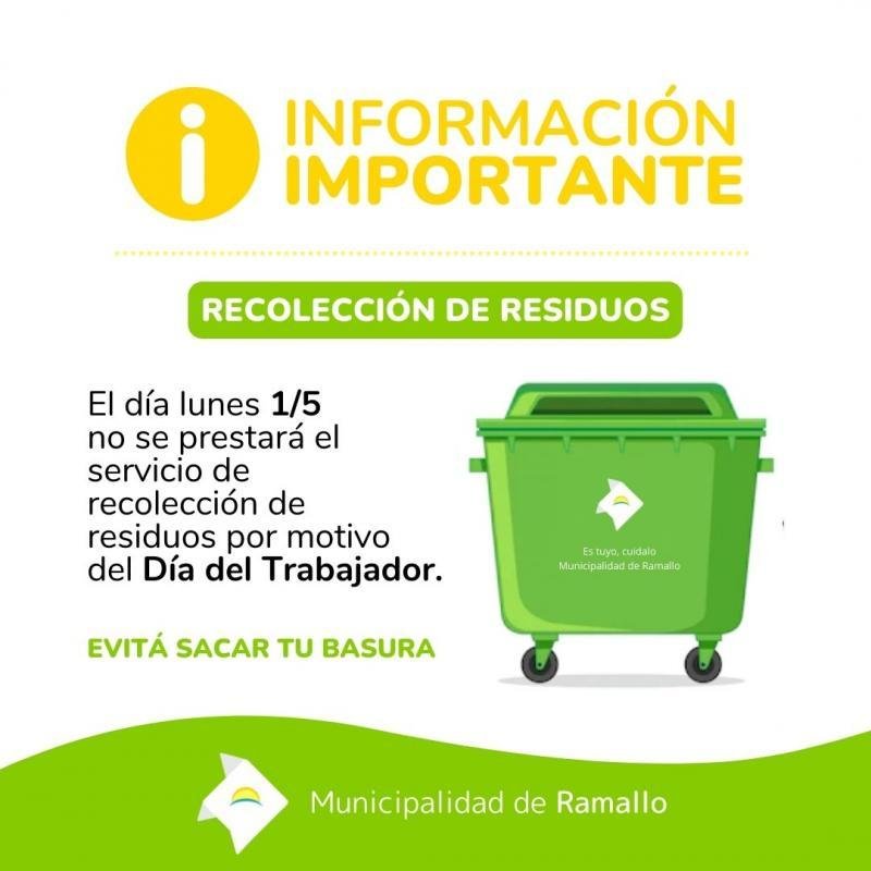 El próximo 1 de mayo, con motivo del Día del Trabajador, se informa que no habrá servicio de recolección de…