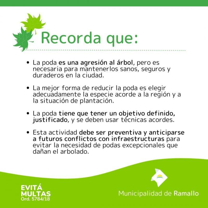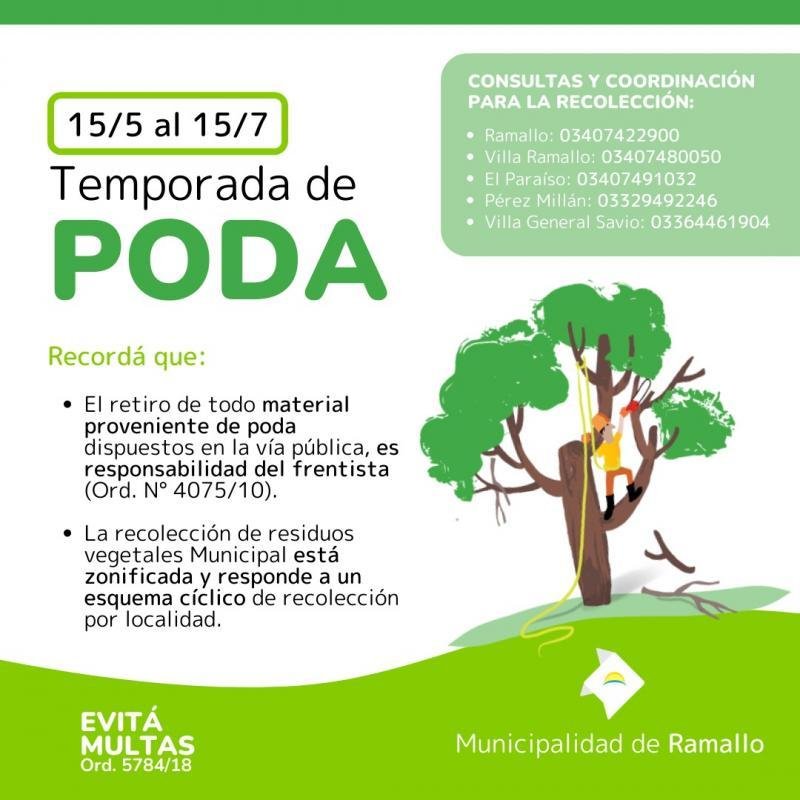 La Municipalidad recuerda a los vecinos que, según lo establecido por la Ordenanza Nº5784/18, la temporada de poda en la ciudad comenzará el próximo 15 de mayo y finalizará el 15 de julio. Asimismo, se recuerda que es responsabilidad del frentista retirar todo el material proveniente de construcciones, refacciones, demoliciones y poda, dispuestos en la vía pública (Ord. N° 4075/10).