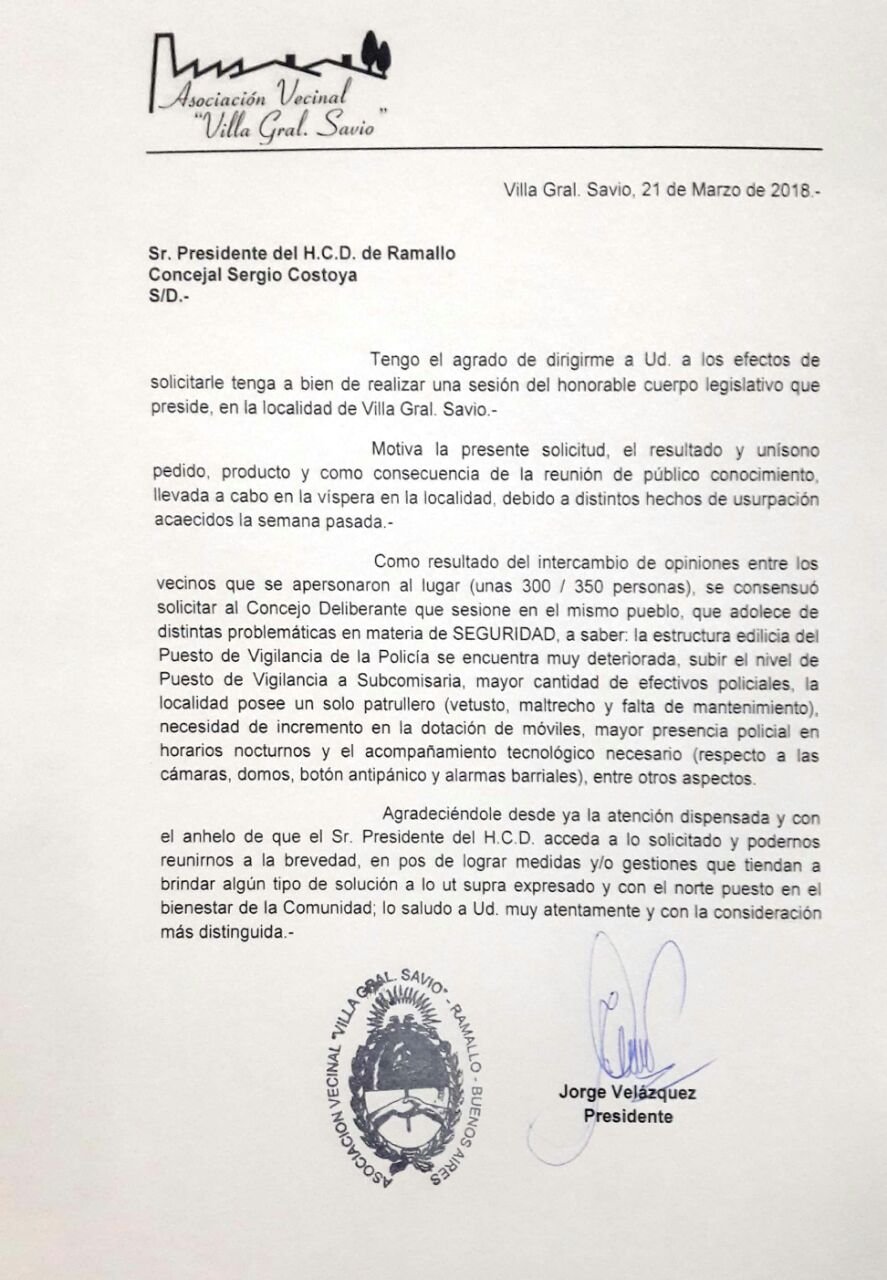 La misiva lleva la firma del presidente de la Asociación Vecinal, el Sr. Jorge Velázquez, y fue presentada por la edil María Luisa Herrera, vecina de la localidad.