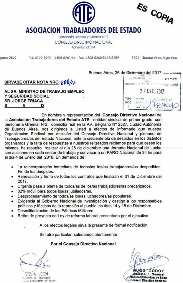 Adrián Lescano, secretario General de ATE seccional Ramallo, Salto y Arrecifes, compartió en las redes sociales la solicitada enviada el ministro de Trabajo de la Nación, Jorge Triaca, declarando el jueves 4 un paro nacional del gremio.