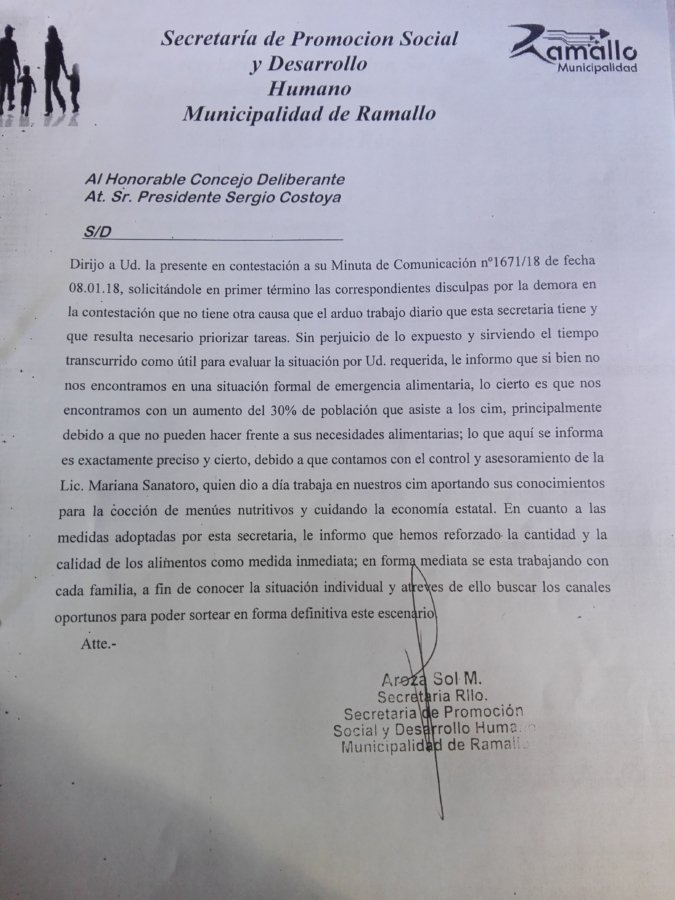 Por medio de una carta, la titular de la cartera de Desarrollo Humano, Dra. Sol Aroza, comunico al Concejo Deliberante del incremento de personas que asisten a los Centros de Integración Municipal, debido a la profunda crisis económica que atraviesan los vecinos.
