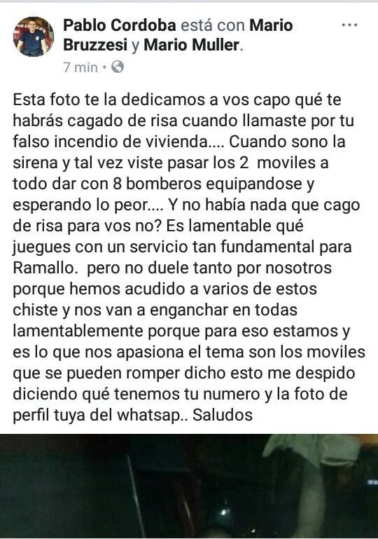 Sobre la lamentable situación, Pablo Córdoba, uno de los miembros del cuerpo activo de Bomberos, a través de su cuenta de Facebook expresó: “Esta foto te la dedicamos a vos capo qué te habrás cagado de risa cuando llamaste por tu falso incendio de vivienda…. Cuando sonó la sirena y tal vez viste pasar los 2 móviles a todo dar con 8 bomberos equipándose y esperando lo peor…. Y no había nada que cago de risa para vos no? Es lamentable qué juegues con un servicio tan fundamental para Ramallo. Pero no duele tanto por nosotros porque hemos acudido a varios de estos chiste y nos van a enganchar en todas lamentablemente porque para eso estamos y es lo que nos apasiona el tema son los móviles que se pueden romper dicho esto me despido diciendo qué tenemos tu número y la foto de perfil tuya del WhatsApp.. Saludos”.