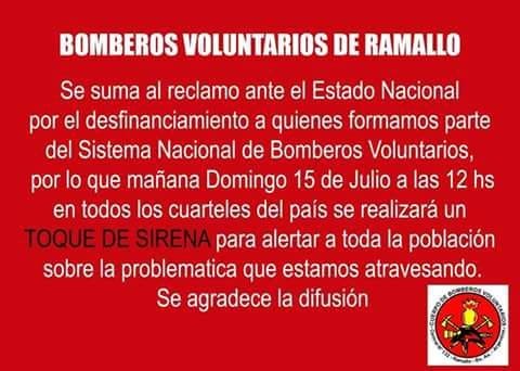 Los diferentes cuarteles de bomberos voluntarios de la Provincia de Buenos Aires se sumaron este domingo masivamente al “sirenazo” y protesta contra el recorte y retención de recursos que el Gobierno Nacional le aplica al sector por estos momentos, según denunciaron. La deuda reclamada ascendería a unos 800 millones para el casi millar de cuartales de todo el país.