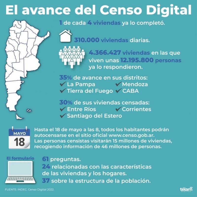 La provincias de La Pampa, Mendoza, Tierra del Fuego y la Ciudad de Buenos Aires ya están cerca del 35% de avance en sus distritos, mientras que Entre Ríos, Corrientes y Santiago del Estero tienen alrededor del 30% de sus viviendas censadas de manera digital, informaron a Télam este mediodía desde el Indec.