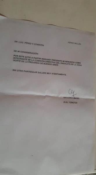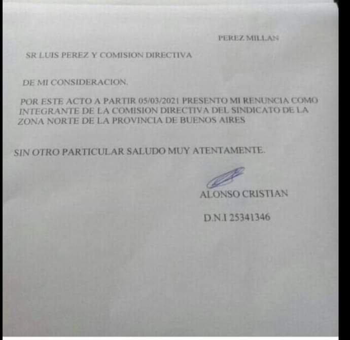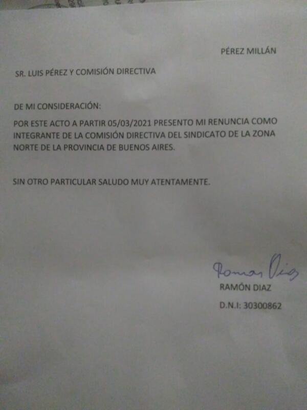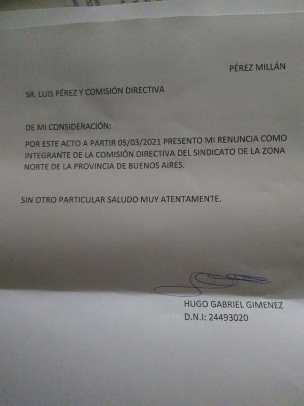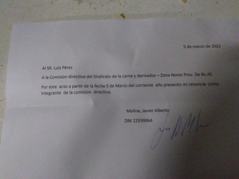 Ante esta situación, los trabajadores se vieron en la obligación de exponer la conformación de la actual comisión del Sindicato de la Carne que lleva como cabeza a Luis Pérez y muchos compañeros que aparecían ocupando algún lugar, hicieron publicas sus cartas de renuncias.