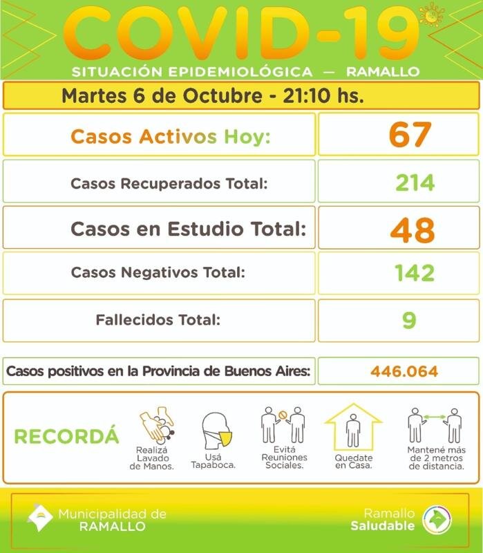 Actualmente contamos con unos  67 casos activos(de los 281), 142 negativos y 48 personas son las que aguardan conocer el resultado de su hisopado. Los decesos acaecidos en nuestro partido son 9.