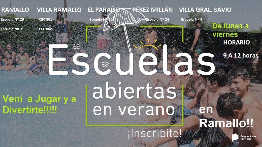 Escuelas Abiertas en Verano es promovido por la Dirección General de Cultura y Educación de la Provincia de Buenos Aires en fuerte articulación con la Municipalidad de Ramallo desde Promoción Social, Educación y Deportes; los Clubes Defensores, Los Andes, Náutico, Social y San Martín, Jefatura Distrital, Consejo Escolar, Secretaría de Asuntos Docentes y Dirección de Tecnología Educativa.
