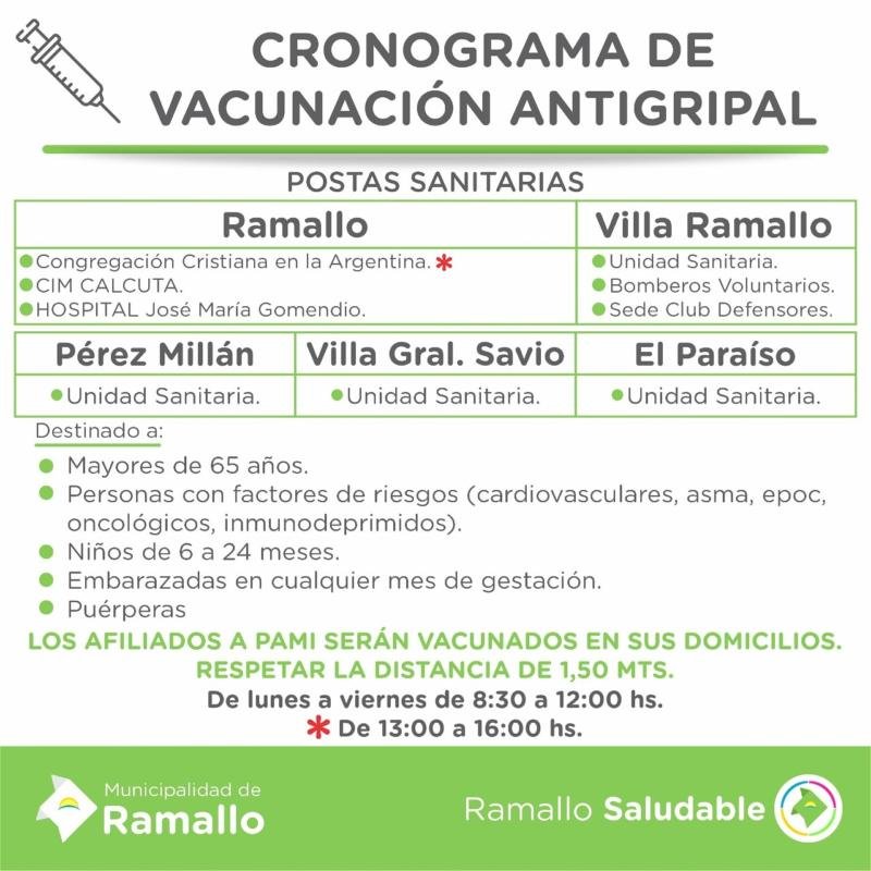 El Municipio de Ramallo informó cómo será la campaña de vacunación antigripal para niños, embarazadas y grupos de riesgo. La campaña será en forma conjunta con PAMI, que a sus 4000 afiliados los vacunará casa por casa con el protocolo establecido.