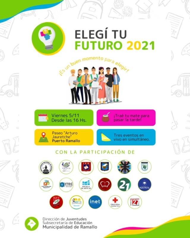 El próximo viernes 5 de noviembre, se realizará en las instalaciones del Paseo Arturo Jauretche (Puerto Ramallo) el encuentro “Elegí tu futuro 2021”, que contará con 17 casas de estudio haciendo difusión de su oferta académica, materiales y carreras para estudiantes en finalización del nivel secundario.