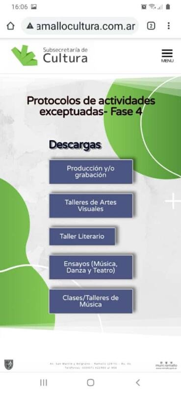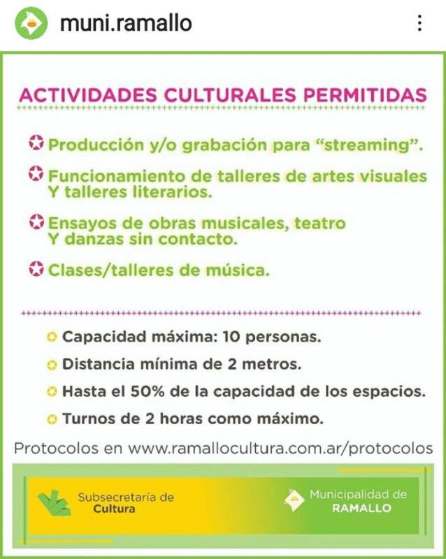 Por su parte, las actividades culturales que volverán a ser permitidas son la producción y/o grabación para streaming, el funcionamiento de talleres de artes visuales y talleres literarios; los ensayos de obras musicales, danzas sin contacto y teatro y las clases o talleres de música. Estas actividades se podrán desarrollar con hasta 10 personas, respetando la distancia mínima de 2 metros, durante 2 horas como máximo y ocupando hasta un 50% del espacio para tal fin. El detalle de los protocolos está disponible en el portal de la Subsecretaría de Cultura: www.ramallocultura.com.ar/protocolos.