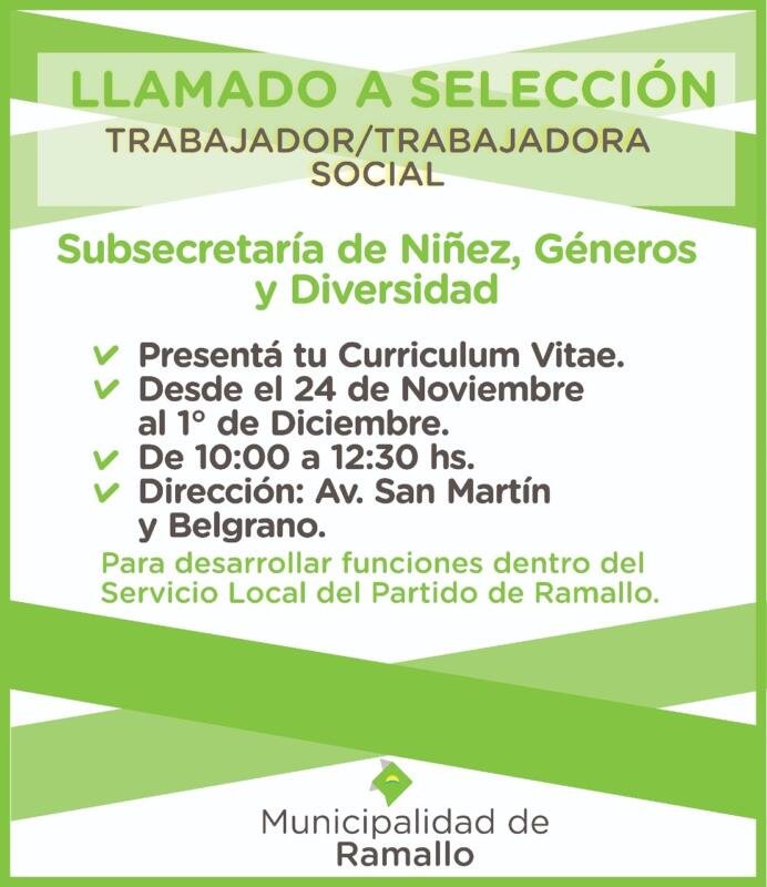 La Subsecretaría de Niñez, Géneros y Diversidad de la Municipalidad de Ramallo realiza el llamado a selección de antecedentes para cubrir cargo previsto por la ley 13298, art.20 y decreto reglamentario 300/05 de Trabajador/a Social para desarrollar funciones dentro del Servicio Local de Promoción y Protección de Derechos de Niños,Niñas y Adolescentes del Partido de Ramallo.