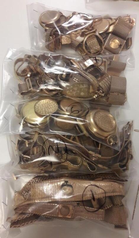 En la bolsa estaban los casi 10 kilos de oro distribuidos en 76 medallas de diversos tamaños y logotipos, 117 anillos de diversos tamaños y formas, 106 mallas para reloj, 72 trozos de mallas, 350 tapas de relojes antiguos, 16 cuadrantes de relojes, 209 coronas de relojes, 14 pulseras y trozos de metal.