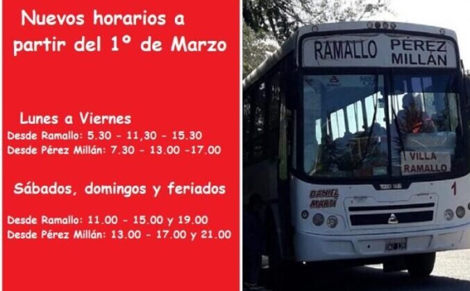 Desde la empresa de Colectivos Daniel Martí, la cual presta servicios desde Ramallo, atravesando Villa Ramallo y La Violeta(partido de Pergamino, hasta llegar a Pérez Millán nos informaron que a partir del mes de Marzo el servicio contara con un nuevo horario.