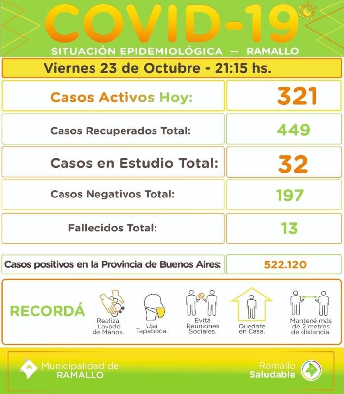 Por tal motivo la actualización de la situación epidemiológica en el Partido de Ramallo hasta anoche(viernes 23 de octubre) quedó de la siguiente manera: