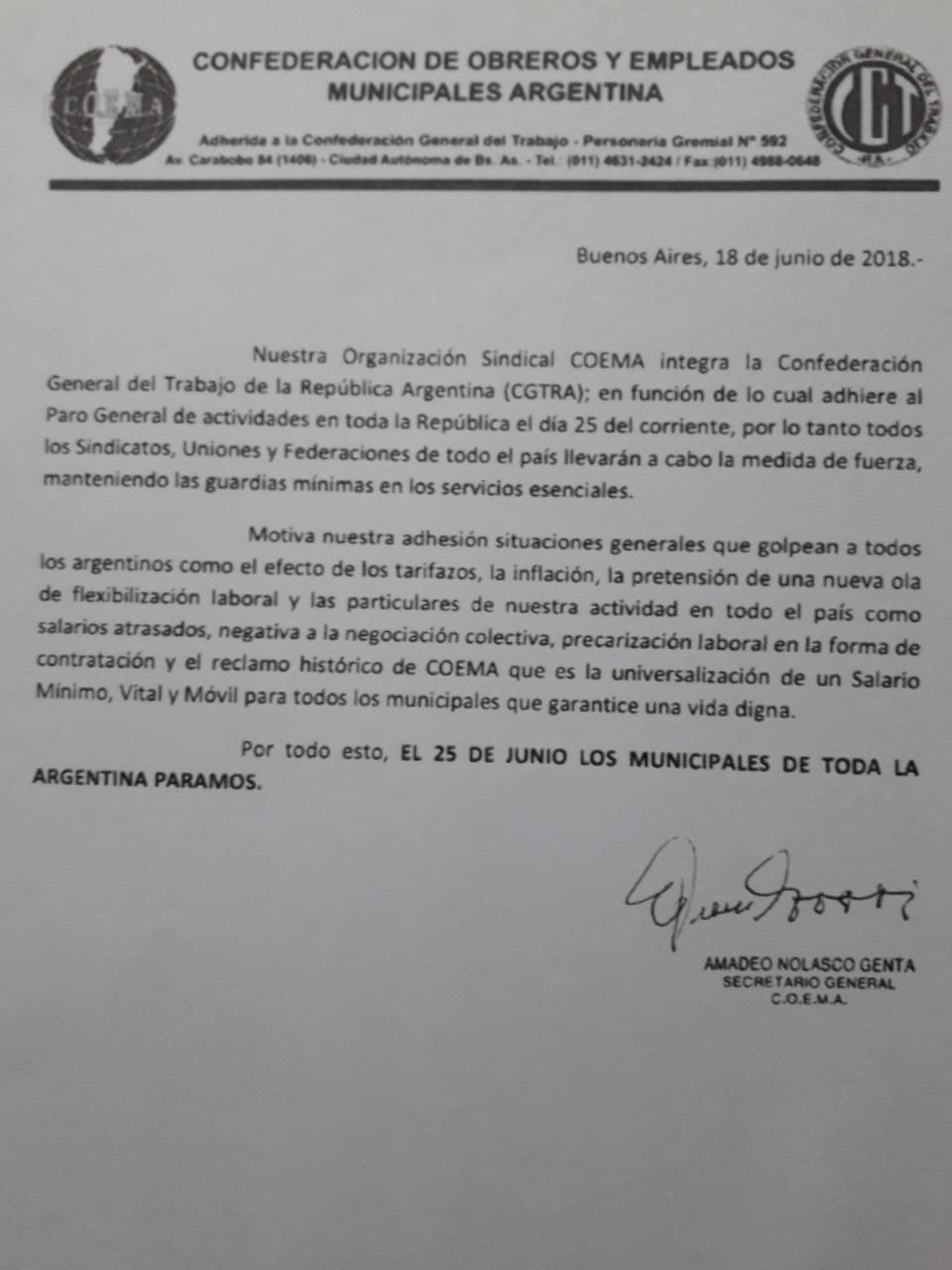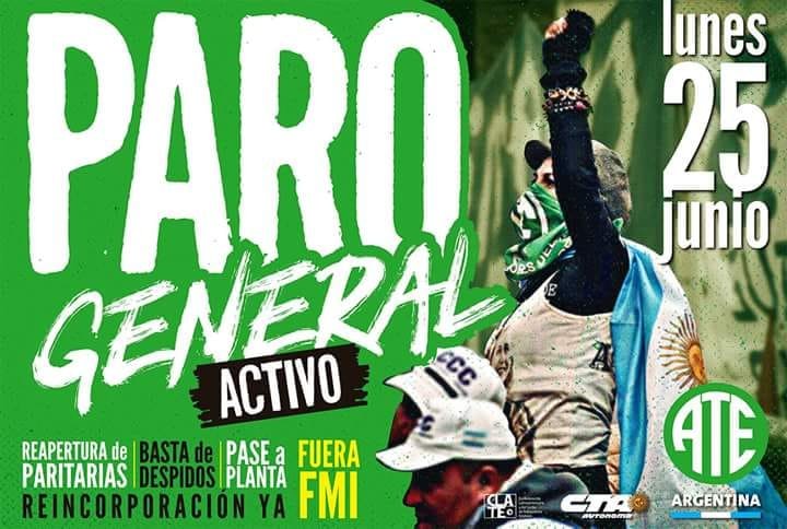 El próximo lunes 25 de junio se realizara un paro nacional convocado por la CGT, y demás organizaciones, que tendrá gran respuesta en las grandes ciudades.