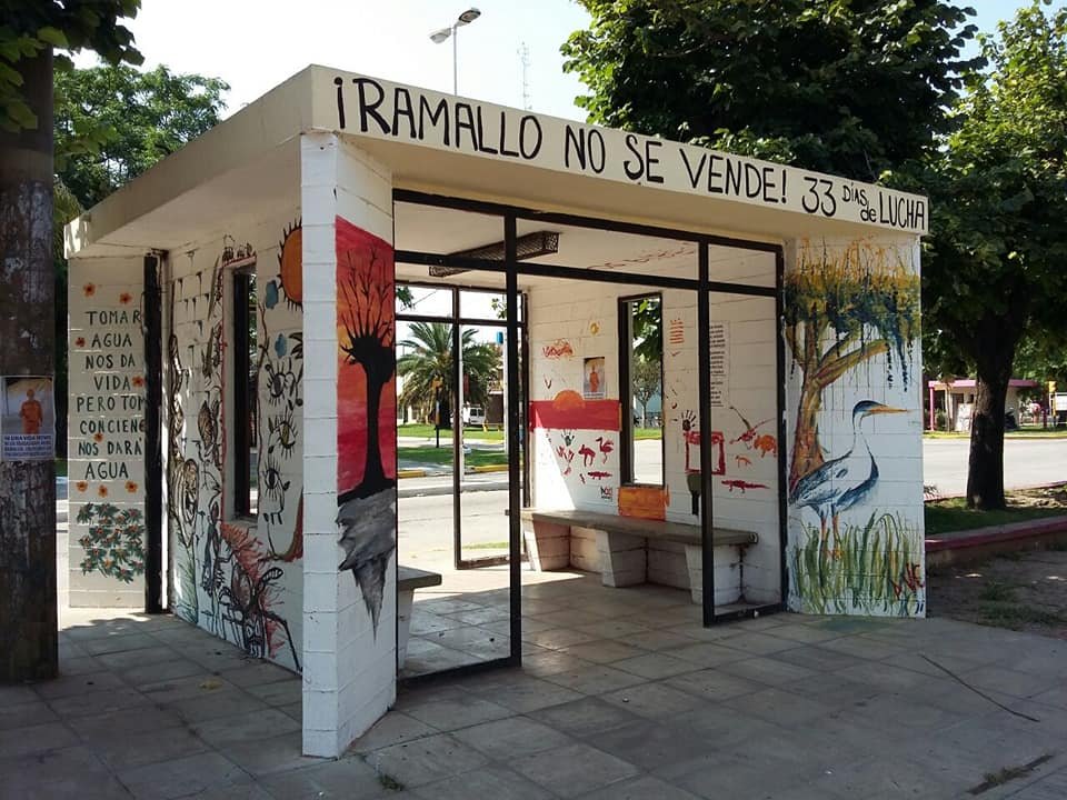 Este mural se realizó luego del Encuentro Regional en Defensa del Paraná y como cierre del acampe realizado por vecinos en contra del infame cambio de zonificación que se propone. Era un símbolo de la defensa del medio ambiente, la salud , nuestros espacios comunes y la denuncia viva de las condiciones de trabajo que padecen nuestros jóvenes.