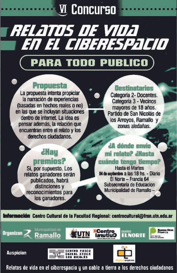 La Municipalidad de Ramallo junto al Centro Cultural de la UTN y Diario el Norte organizan el Concurso “Relatos de vida en el ciberespacio y un cable a tierra a los derechos ciudadanos” dirigido a estudiantes de nivel secundario, docentes y vecinos que deseen profundizar en las nuevas tecnologías