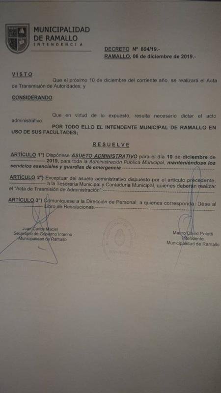 El intendente saliente Mauro Poletti decretó asueto administrativo en la administración municipal en el marco del acto de transición de autoridades. La directiva alcanza a toda la administración local, exceptuando la Tesorería y Contaduría, quienes serán los encargados de llevar adelante el acta de transmisión de administración.