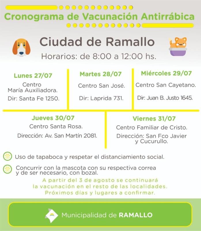 Desde la municipalidad informaron cuál será el cronograma de vacunación antirrábica en la ciudad de ramallo. Dicho esquema abarca toda una semana y están visitando diferentes puntos de la ciudad en pos de que cada persona pueda elegir el día y lugar que más cómodo le quede previniendo la circulación masiva de personas.