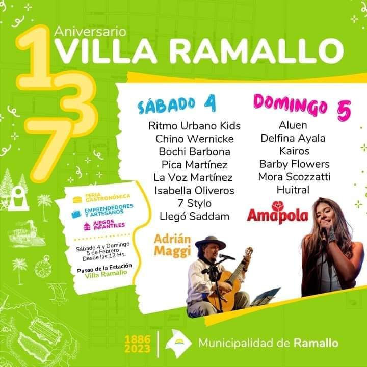 En el marco del 137º aniversario de la localidad de Villa Ramallo, los invitamos a acercarse al playón de la estación a disfrutar de la celebración que contará con feria gastronómica, artesanías, música en vivo y sorpresas.