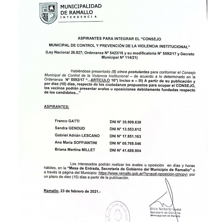 Los ciudadanos podrán presentar avales u oposición de forma personal en Mesa de Entradas o de forma online en este link: https://ramallo.gob.ar/?q=aval-oposicion-cmcpvi