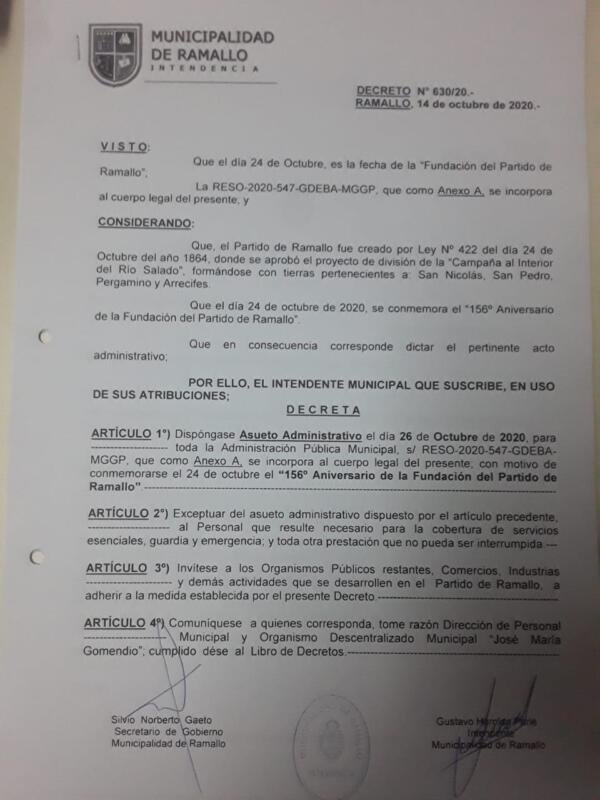 Con motivo del 156° aniversario de la Fundación del Partido de Ramallo, el decreto 630/20 dispone que el próximo lunes 26 de octubre sea asueto administrativo municipal.