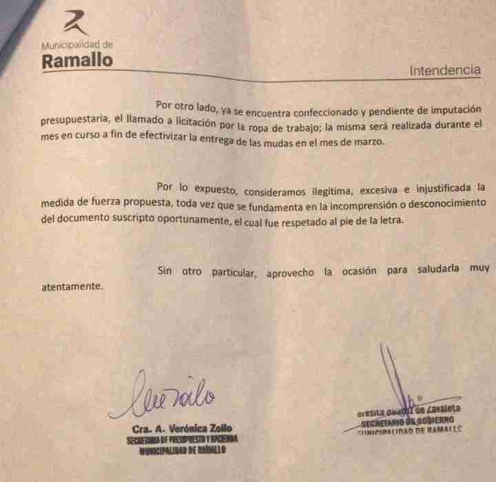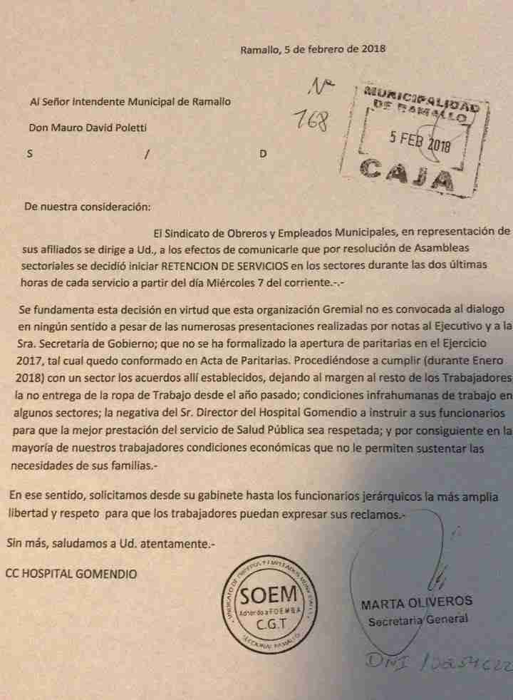 El 6 de febrero, el ejecutivo municipal, anticipándose a la medida de fuerza del miércoles, le responde punto por punto al SOEM por medio de una nota. La misma nunca fue recibida ante la negativa de su secretaria, Marta Oliveros, que justificó su decisión porque la misma no estaba firmada por el intendente Poletti. La nota llevaba la rúbrica de la Secretaria de Gobierno y la Secretaria de Hacienda, dependencias que están en la mesa paritaria.