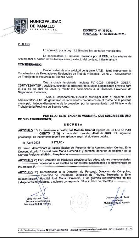 El gobierno municipal otorgó un aumento del 8 % para los empleados municipales correspondiente al mes de abril del corriente año. Este porcentaje se suma al 6.6% del mes de marzo , garantizando con ambos los incrementos salariales propuestos en la mesa paritaria local.