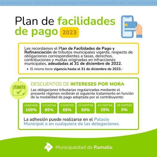 La Municipalidad de Ramallo quiere informar a los contribuyentes sobre la disponibilidad del Plan de Facilidades de Pago y Refinanciación para el año 2023. Este plan abarca las deudas pendientes de tasas, derechos, contribuciones y multas derivadas de infracciones municipales que hayan sido acumuladas hasta el 31 de diciembre de 2022. Es importante destacar que este plan estará en vigor hasta el 31 de diciembre de 2023, ofreciendo a los ciudadanos una modalidad de pago flexible y accesible para regularizar sus obligaciones con el municipio.