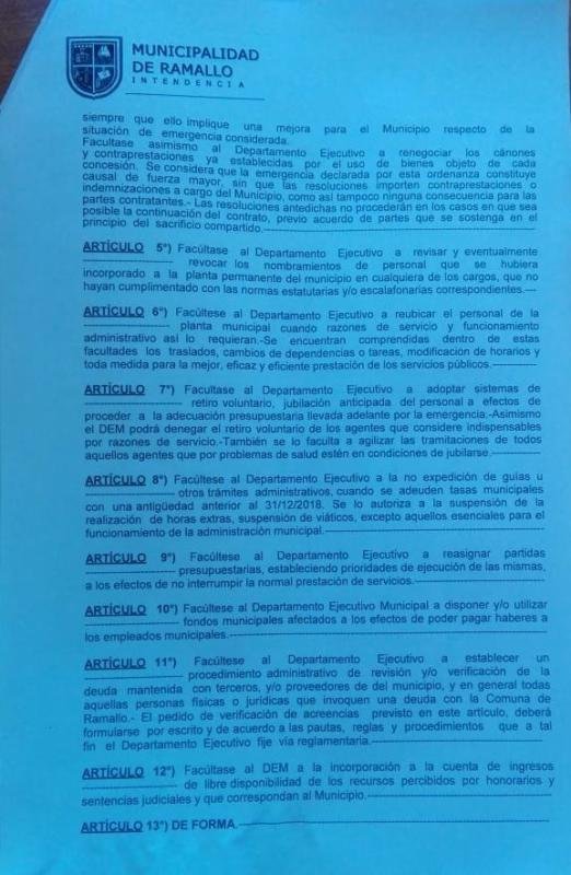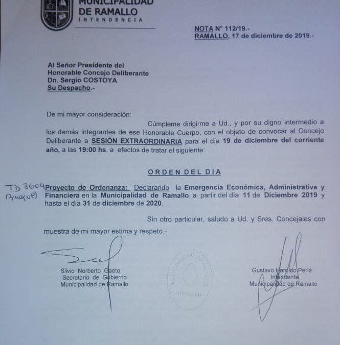 El intendente Gustavo Perie envió un proyecto de ordenanza para declarar la Emergencia Económica, Administrativa y Financiera en la Municipalidad de Ramallo, desde el 11 de diciembre del 2019 al 31 de diciembre de 2020.