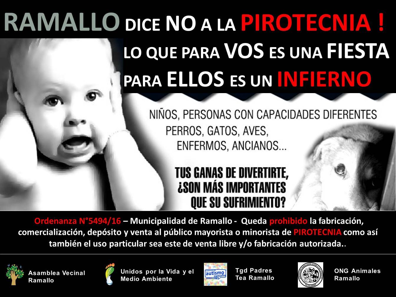 Debe enorgullecernos el hecho de ser parte del 33% de los partidos de la Provincia Libres de Pirotecnia. Es por ello que venimos a ofrecerle nuestra voluntad y predisposición para que ésta, junto con otras ordenanzas de nuestro partido, puedan cumplirse armoniosamente. No por imposición sino por solidaridad y conciencia ciudadana. Pero para que esto se logre necesitamos del compromiso y las herramientas que sólo el Municipio puede aportar.