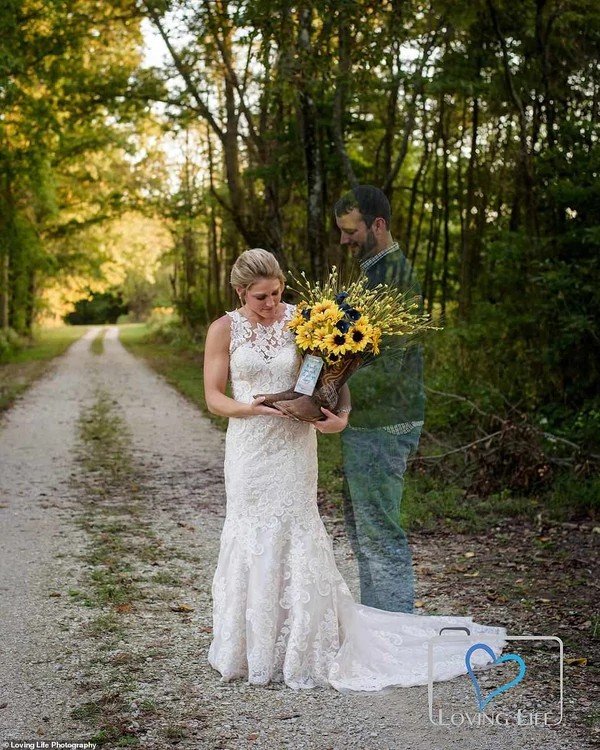 En una de las fotos más conmovedoras, Jessica sostiene las botas de cowboy de sus prometido, quien, a través de un efecto realizado con Photoshop, parece estar a su lado, como si fuera un espectro o un espíritu.