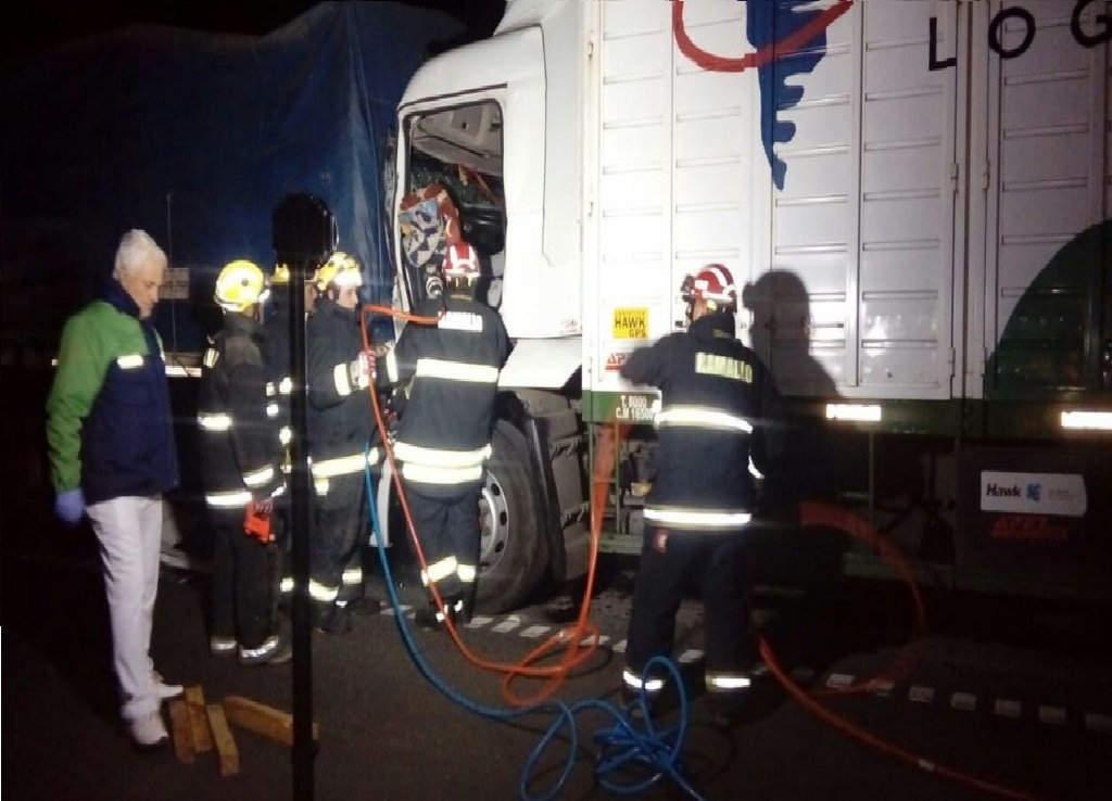 Un Mercedes Benz y un Ford Cargo colisionaron y como consecuencia del siniestro el chofer del Ford quedó atrapado en la cabina. Ahí comenzaron las tareas del personal de bomberos quienes, mediante el uso de herramientas hidráulicas y luego de una ardua tarea que llevó cerca de 45 minutos, lograron recatarlo, inmovilizarlo y entregarlo al personal del CEM para su traslado al hospital Gomendio.