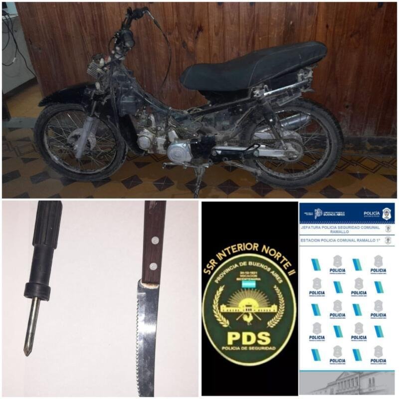 El día domingo 05 de junio se recibe la denuncia de un mayor  informando que autores ignorados le sustraen de vía publica una moto de la marca Guerrero de 110 CC, de color negra, con dominio colocado. Rápidamente después de tareas investigativas realizadas por personal de esta Comisaria Primera de Ramallo (GTO), se estableció autoría del hecho tomando conocimiento que el mismo estaría dando vuelta en el rodado en vía pública, en calle Córdoba y Cucurullo. Logrando dar con un masculino menor de edad (14) el cual se trasladaba con el rodado sustraído, procediéndose a la inmediata aprehensión y posterior traslada a sede policial. Al momento del cacheo preventivo el menor tenia en su poder un destornillador y cuchillo de cocina. Se puso en conocimiento a UFI del Joven el cual dispuso notificación Art.36 de la ley 13634 y posterior entrega a sus progenitores.- Posteriormente se hace entrega del rodado a su propietario.- Se iniciaron actuaciones por el delito de Hurto.-