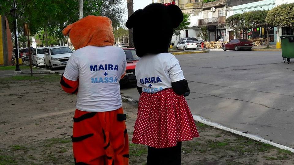 La candidata del massismo en Ramallo, Maira Ricciardelli baso gran parte de su campaña en disfraces de muñecos y repartiendo caramelo a los chicos. A cambio, la foto que se viraliza en las redes sociales.