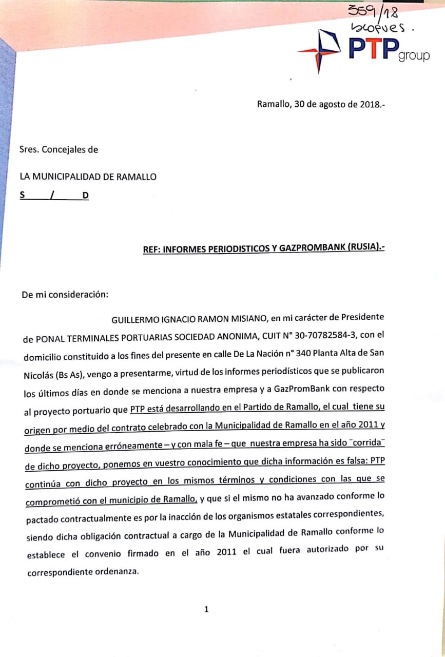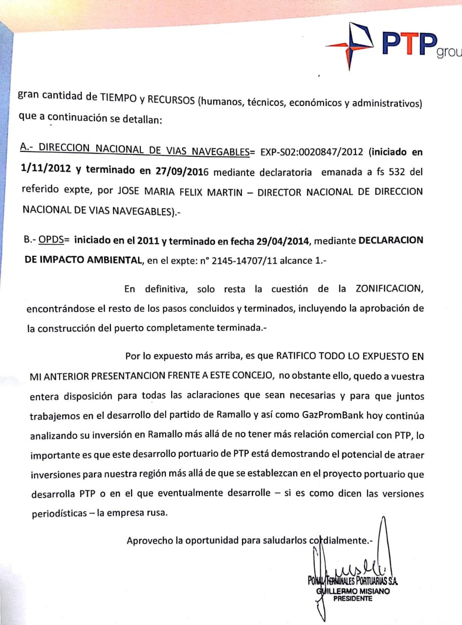 Guillermo Misiano, presidente de PTP Group, envió cartas a cada uno de los integrantes del Concejo Deliberante reafirmando su intención de cumplir lo pactado en el convenio firmado con la Municipalidad de Ramallo. Además salió a desmentir versiones periodísticas, donde se mencionaba que la empresa había sido “corrida” del proyecto. Según la empresa existió “mala fe” por partes de algunos medios periodísticos que insinuaron que el convenio se caería por inacción de la empresa.
