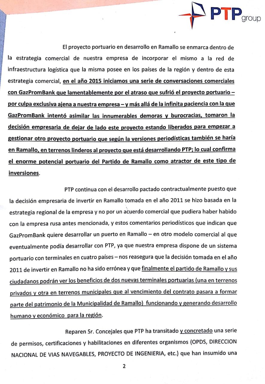 “En el año 2015 iniciamos una serie de conversaciones comerciales con GazPromBank que lamentablemente por el atraso que sufrió el proyecto –por culpa exclusiva ajena a nuestra empresa- y más allá de la infinita paciencia con la que GazPromBank intento asimilar las innumerables demoras y burocracia, tomaron la decisión empresaria de dejar de lado este proyecto estando liberados para empezar a gestionar otro proyecto portuario que según la versiones periodísticas también se haría en Ramallo, en terrenos linderos al proyecto que está desarrollando PTP”, afirmaron desde la empresa.