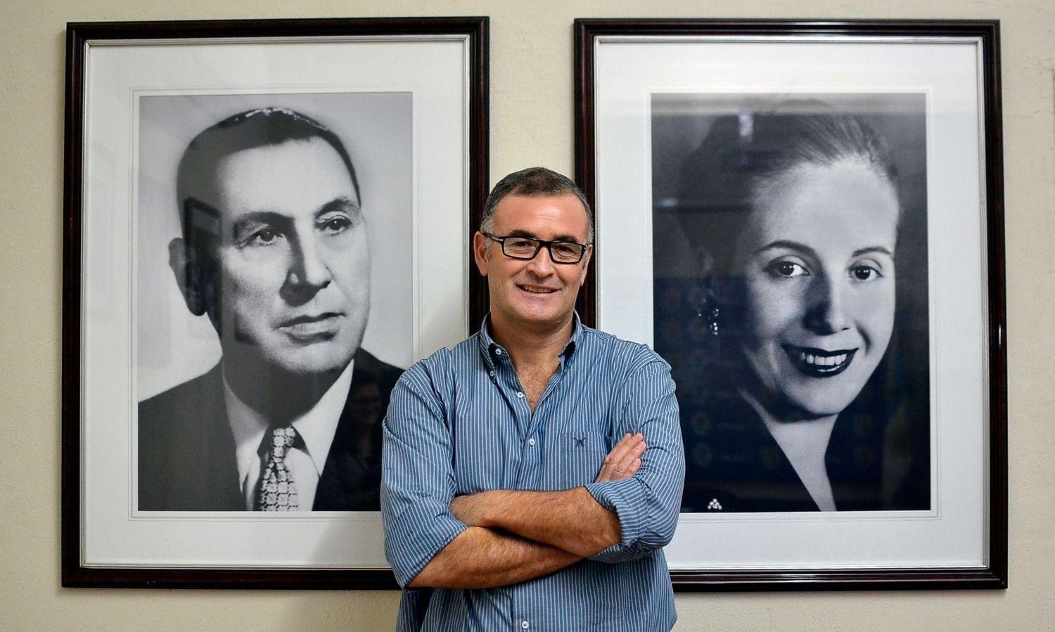 El intendente recibe a Letra P en su despacho. Una oficina pequeña, sin extravagancias ni mobiliario especial. Varios portarretratos con imágenes de los líderes del peronismo sobre una mesa y seis pantallas de televisores son, quizá, los únicos elementos que distinguen esta oficina del resto. Por eso a la hora de las fotos el lugar elegido es la sala de reuniones. Un amplio espacio con imágenes del escudo de Ramallo y de los últimos presidentes, incluso del actual. “Yo sólo puse esos, el resto ya estaba”, explica y señala las fotografías de Juan Domingo Perón, Eva Duarte y Cristina Fernández de Kirchner.