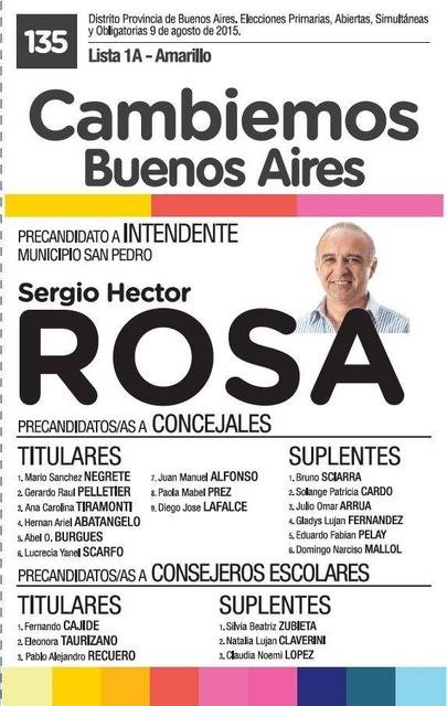 En el caso de San Pedro, el aporte para esa campaña suma casi 500 mi pesos. El precandidato a intendente, Sergio Rosa, aparece con 50.000; los concejales titulares del primero al sexto lugar —Mario Sánchez Negrete, Gerardo Pelletier, Ana Tiramonti, Hernán Abatángelo, Abel Burgues y Lucrecia Scarfó—, con 38.000.