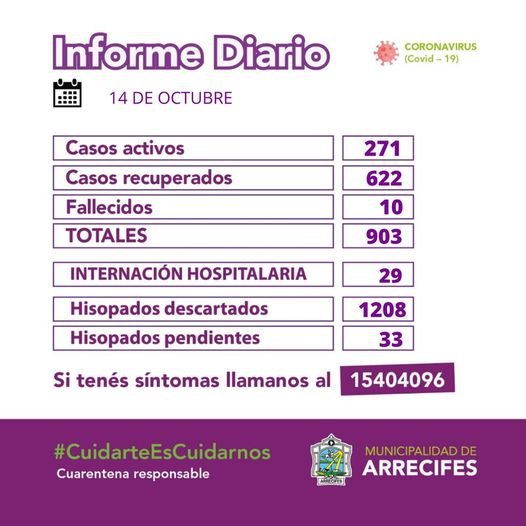 Según el ultimo reporte han sido reportados 27 nuevos casos de covid-19 en arrecifes, alcanzando desde el inicio de la pandemia, y con los nuevos parámetros de diagnóstico (hisopados, criterio clínico, y nexo epidemiológico), un total de 903 casos positivos de los cuales 271 se encuentran activos, 622 han recibido el alta medica, por lo que se consideran casos recuperados y se registraron 10 victimas fatales de coronavirus.