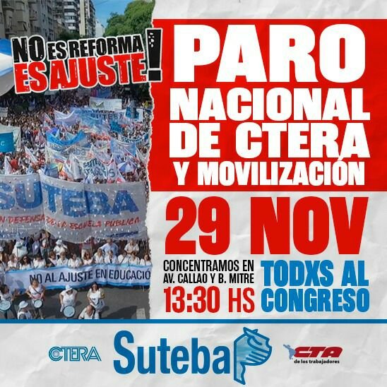 El SUTEBA, como organización de base de CTERA, se adhiere a la decisión unánime que tomó la Confederación en su Congreso Extraordinario por la realización de dos acciones para mañana, miércoles 29, en el Paro Nacional Docente y Movilización al Congreso de la Nación, a partir de las 13:30 hs, en rechazo a las reformas laboral, previsional e impositiva que impulsa el Poder Ejecutivo Nacional.