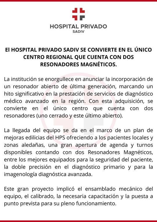 SALUD Hospital Privado Sadiv: incorporacion de nuevo resonador abierto de última generación Por GABY martes 16 enero, 2024 martes 16 enero, 2024 Home destacadashospital privado sadivresonador abiertoSalud compartir 0 FacebookTwitterWhatsappTelegramEmail Posteo anterior Secuestro de Drogas y Arma de Fuego en Caso de Abigeato Proximo posteo En Defensa del Arte y la Identidad Te podría interesar Nueva Sala Oncológica en el Hospital José María Gomendio miércoles 21 enero, 2026 La ONG Animales Ramallo llevará a cabo una nueva jornada de castraciones a bajo... martes 13 enero, 2026 Informa Bromatología Ramallo : Lotes retirados del Mercado – NESTLÉ ARGENTINA S.A. martes 6 enero, 2026 Récord en el Garrahan: 145 trasplantes realizados sábado 3 enero, 2026 Campaña de Vacunación gratuita contra el Dengue en Ramallo miércoles 17 diciembre, 2025 La Justicia Ordena la Aplicación Inmediata de la Ley de Emergencia en Discapacidad domingo 14 diciembre, 2025 Derechos de Discapacidad: Ramallo Refuerza Concientización sábado 13 diciembre, 2025 Animales Ramallo Ong: Castraciones a bajo costo jueves 11 diciembre, 2025 Ramallo necesita donantes de sangre – Salvá vidas antes de fiestas jueves 27 noviembre, 2025 Prevención: El Hospital Visita las Escuelas de El Paraíso domingo 23 noviembre, 2025