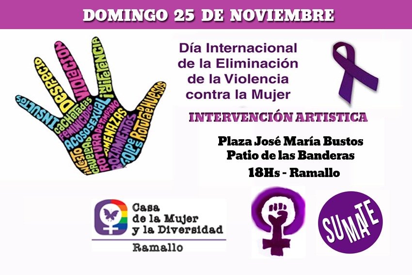 Este domingo, 25 de noviembre, se conmemora el Día Internacional de la Eliminación de la Violencia contra la Mujer. En este marco, desde la Casa de la Mujer y la Diversidad de Ramallo realizará una intervención artística y musical en la Plaza José María Bustos de Ramallo. Será en el Patio de las Bandereas, desde las 18hs.