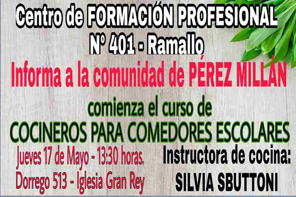El Centro de Formación Profesional Nº401 Ramallo, informa que el día jueves 17 de mayo dará comienzo en la localidad de Pérez Millán el curso de “COCINEROS PARA COMEDORES ESCOLARES”.