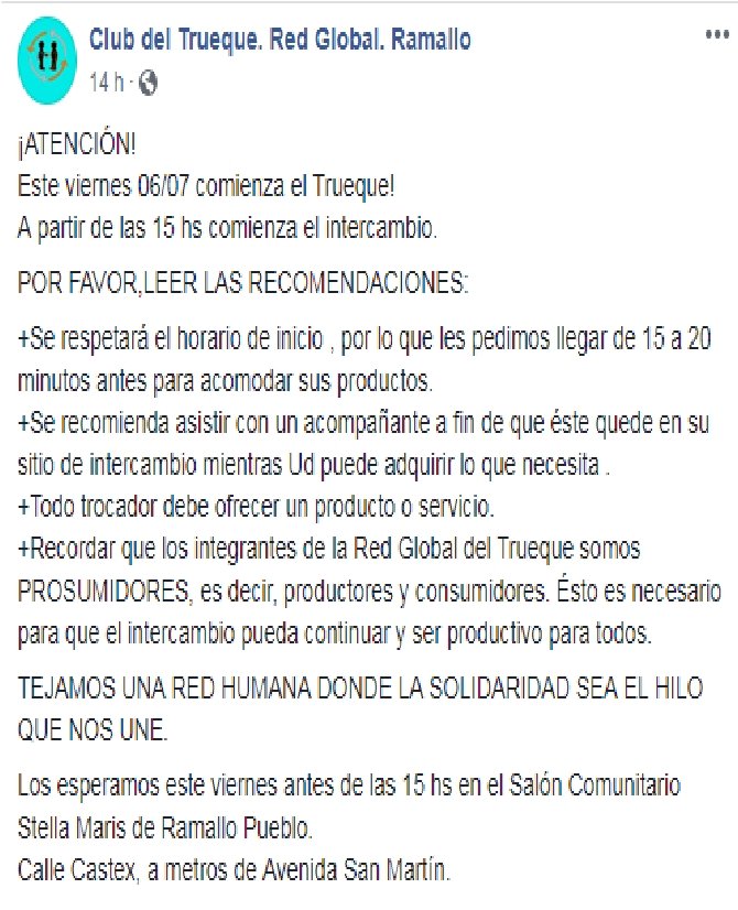 Quienes impulsaron la vuelta del trueque, crearon una página de Facebook donde hicieron llegar a todos los interesados la información sobre el funcionamiento y algunas recomendaciones para los que deseen participar, la misma se llama: “Club del Trueque. Red Global. Ramallo”