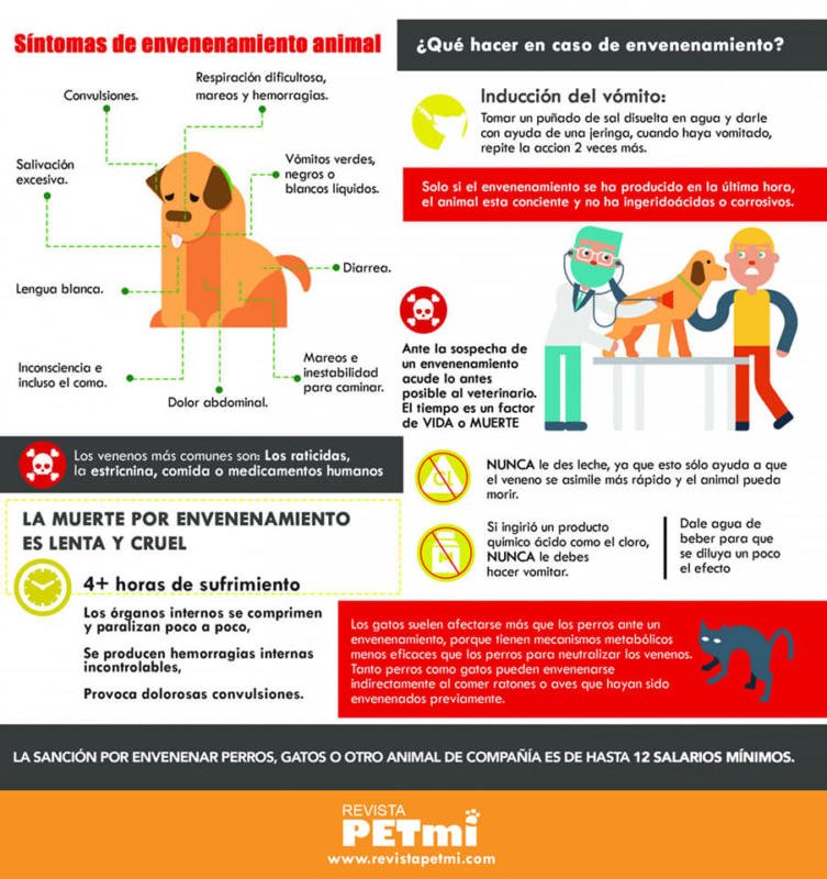 Si encuentras a tu mascota con alguno de estos síntomas, lo primero que debes hacer es ir con un Veterinario. Si el animalito está consciente, como primer medida puedes inducir un vómito con un puñado de sal diluido en agua, se la das con la ayuda de una jeringa, cuando haya vomitado, repetir esa acción dos veces más.