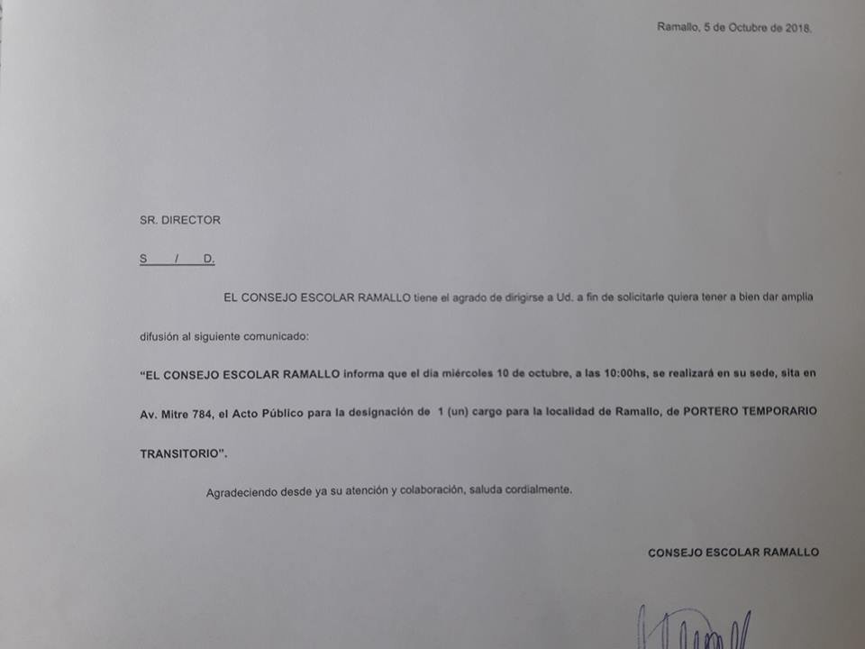 Los interesados deberán presentarse en la sede del Concejo Escolar Ramallo el día Miércoles 10 de octubre a las 10:00hs. La designación será para cubrir una vacante de portero transitorio en Ramallo.